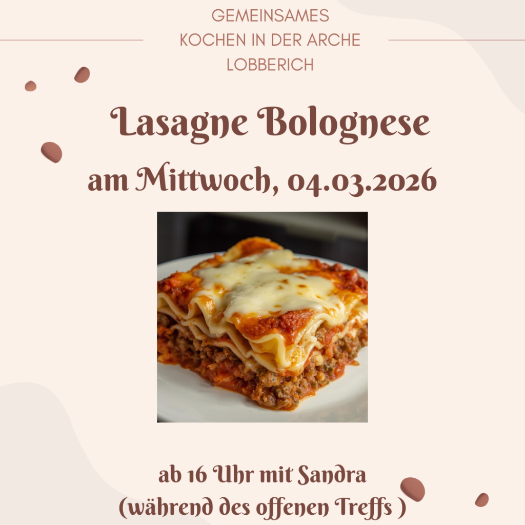 • Mittwoch am 04.03.2026 gibt’s Lasagne in der Arche! März 3, 2026